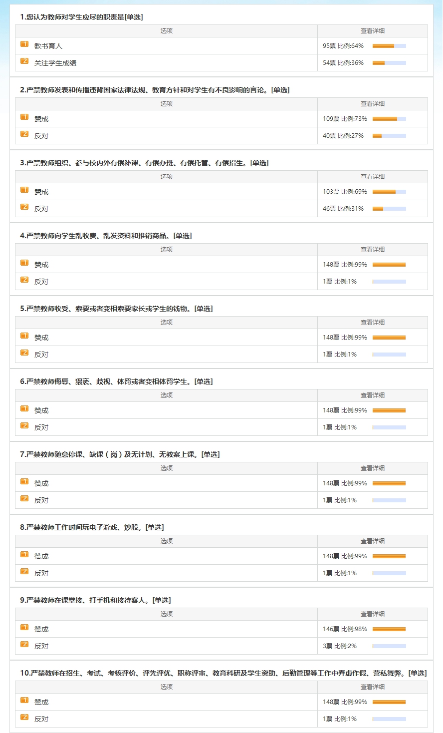 我局于2018年7月16日在昆明市教育体育局门户网站“互动交流”专栏“调查征集”栏目发布了“2018年昆明市教育系统师德师风建设社会调查问卷”,广泛征求社会各界的意见,不断深化师德师风建设,努力办好人民满意的教育,特开展师德师风建设社会调查,希望网友本着“对孩子负责、对教育负责、对社会负责”的态度,积极参与到活动中来,留下宝贵意见和良好建议。现将调查结果及意见采纳情况通报如下: