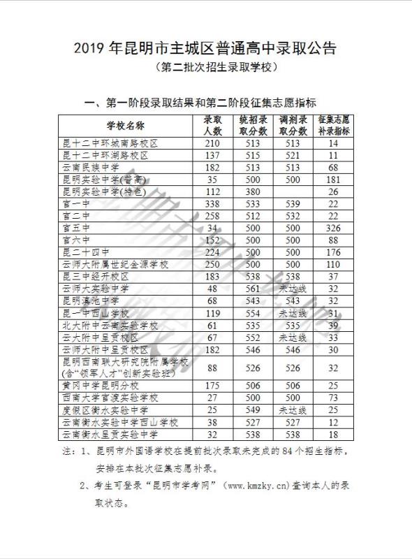2019年昆明市主城区普通高中录取公告(第二批次招生录取学校)
