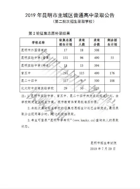 2019年昆明市主城区普通高中录取公告(第二批次招生录取学校)第2轮征集志愿补录结果