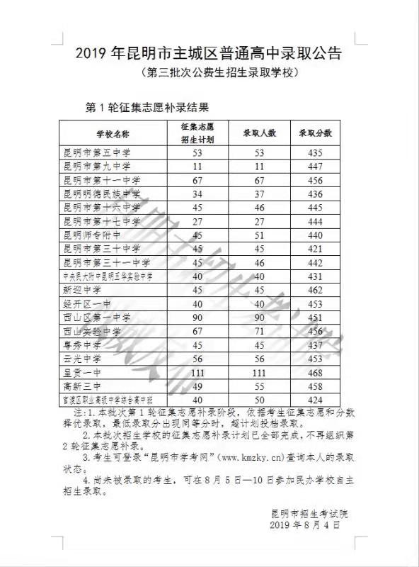 2019年昆明市主城区普通高中录取公告(第三批公费生招生录取学校)