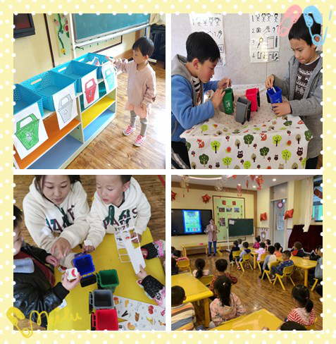 各班教师结合幼儿年龄特点和发展水平,通过区域活动、集体活动、餐前活动等形式,让幼儿在说一说、认一认、分一分、做一做等活动中种下环保的种子。教师用垃圾分类箱告诉孩子们如何对垃圾进行分类,哪些属于可回收垃圾、哪些属于不可回收垃圾、哪些是厨余垃圾、哪些是其他垃圾,并教育幼儿通过主动操作,能在日常生活中主动、自觉地进行垃圾分类,爱护我们共同的家园。