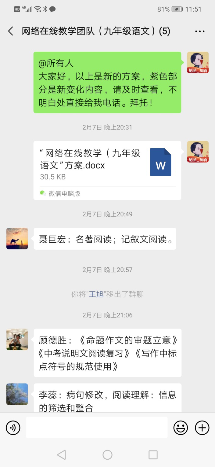 办法总比困难多。打了一个多小时的电话,三个团队终于组建好了。最紧迫的九年级语文线上教学团队由以下5位受命于危难之间的老师组成: