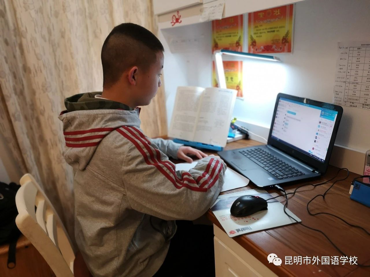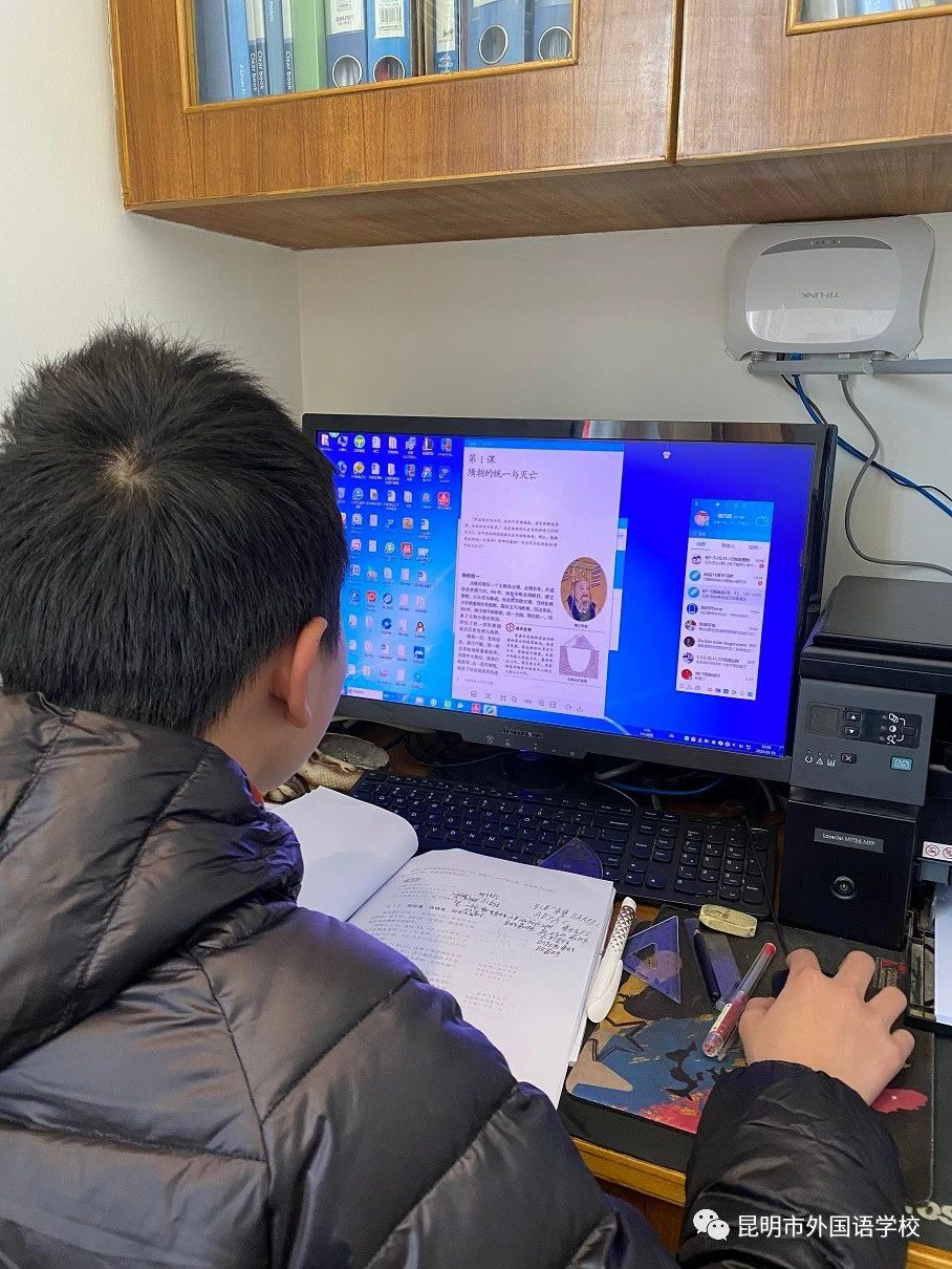 风雨中的灯火,微弱又清晰。是谁说,不放弃?在这一猝不及防的“战疫”中,昆明市外国语学校的全体师生并没有按下“暂停键”,而是克服困难,齐心协力,坚决贯彻落实党中央、国务院和省委、省政府疫情防控工作部署,在学校党委的领导下,认真贯彻落实国务院联防联控机制《关于依法科学精准做好新冠肺炎疫情防控工作的通知》和省应对新冠肺炎疫情工作领导小组指挥部办公室《关于2020年春季学期延期开学的通知》的要求,扎实将“严防扩散、严防暴发,确保一方净土、确保生命安全”落到实处。以“直播+录播+线上答疑”的形式,展开网络直播教学活动,全面落实“五育并举”,最大限度降低疫情对学校教学工作的影响。截至2月24日,我校各年级线上教学全面开展。初三、高三的孩子们,迫近的考试,停滞的课程,都是令人焦虑的,昆明教育电视台于2月10日为高三学子们开设了名师电视直播课堂,初三师生也就同步展开网络直播教学活动,17日高一、高二也紧紧跟上。24日,初一、初二和高中附属泰语课程中心也顺利开展教学。
