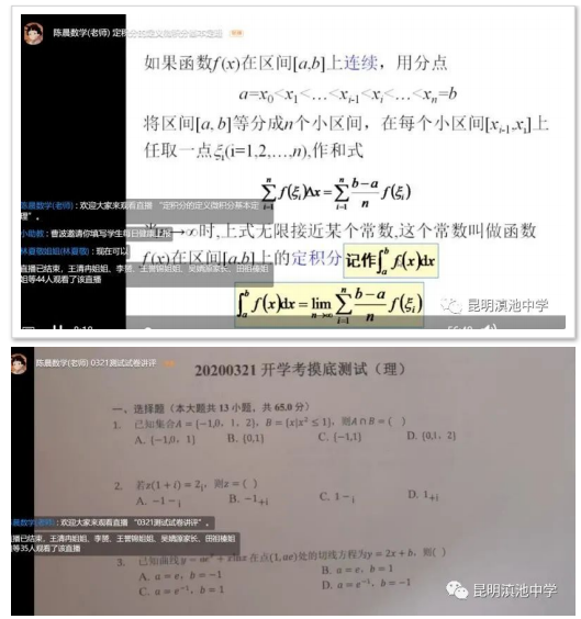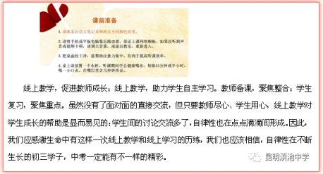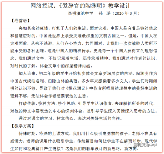 为 了 打 赢 新 型 冠 状 病 毒 引 起 的 肺 炎 这 场 没 有 硝 烟 的 战 争 , 为 切 实 阻 断 新 型 冠 状 病 毒 引 起 的 肺 炎 疫 情 向 校 园 蔓 延 , 我 校 积 极 响 应 国 家 举 措 , 延 期 开 学 。 在 各 种 网 课 风 起 云 涌 的 当 下 , 昆 明 滇 池 中 学 党 总 支 认 为 学 生 宅 家 的 日 子 正 是 落 实 核 心 素 养 、 促 进 全 面 成 长 的 良 好 契 机 ; 全 体 教 师 认 真 贯 彻 陪 伴 学 生 终 身 成 长 的 教 育 初 心 , 始 终 坚 持 以 培 养 学 生 的 核 心 素 养 为 抓 手 。 为 保 证 “ 线 上 教 学 ” 尽 早 实 施 , 我 们 的 老 师 们 积 极 响 应 号 召 , 立 刻 行 动 , 全 面 备 战 , 为 正 式 开 课 做 好 充 分 准 备 , 老 师 们 也 成 为 了 抗 疫 路 上 的 “ 逆 行 者 ” ! 于 是 , 一 节 节 精 心 设 计 的 精 彩 网 课 纷 纷 诞 生 !