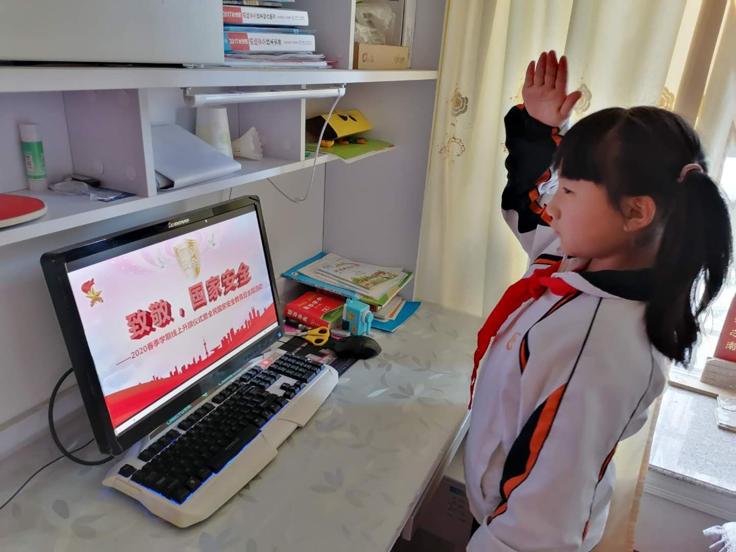 四、组织全体师生开展“致敬,国家安全”线上升旗仪式,让全校学生明白国泰民安是人民群众最基本、最普遍的愿望。实现中华民族伟大复兴的中国梦,保证人民安居乐业,国家安全是头等大事。全体师生也深刻认识到国家安全与公民息息相关,维护国家安全,人人有责,人人可为。如果发现有危害各领域国家安全的活动线索与证据,要履行公民维护国家安全的责任与义务,做到及时报告。