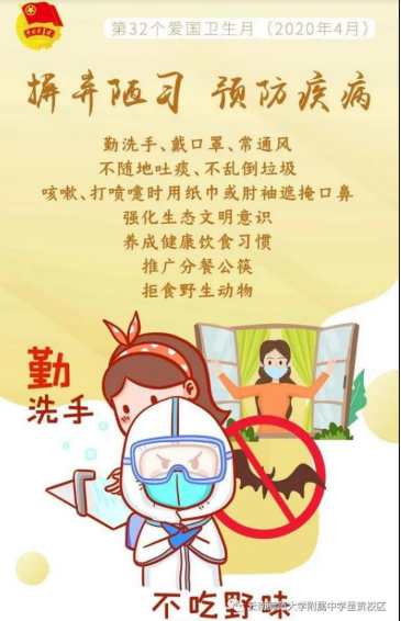 让我们养成良好的卫生习惯,积极响应习近平总书记 “坚持预防为主,深入开展爱国卫生运动,倡导健康文明生活方式,预防控制重大疾病”的号召,积极参与疫情防控。防疫有我,爱卫同行!