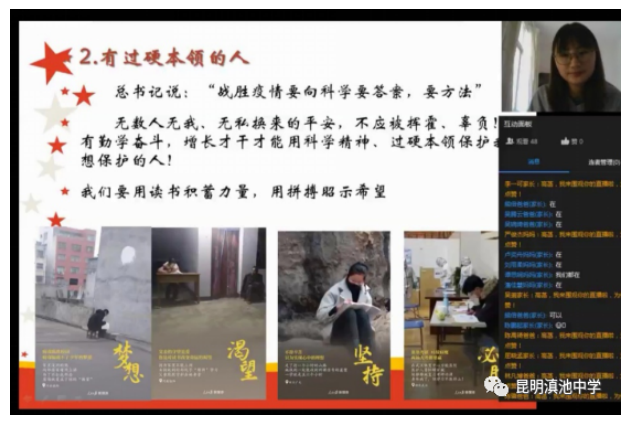 90 后 高 晗 老 师 , 在 网 课 上 深 情 地 说 , 在 这 个 春 天 , 有 上 万 名 医 护 工 作 者 去 到 湖 北,站在最危险的、民众最需要的地方,一步不退。这就是中国医者!从耄耋院士到 “90后”“00后”,他们出生于不同的年代,但都肩负着同样的职责和使命,用生命 隔离病毒,把人民护在了身后,上演着最美逆行。