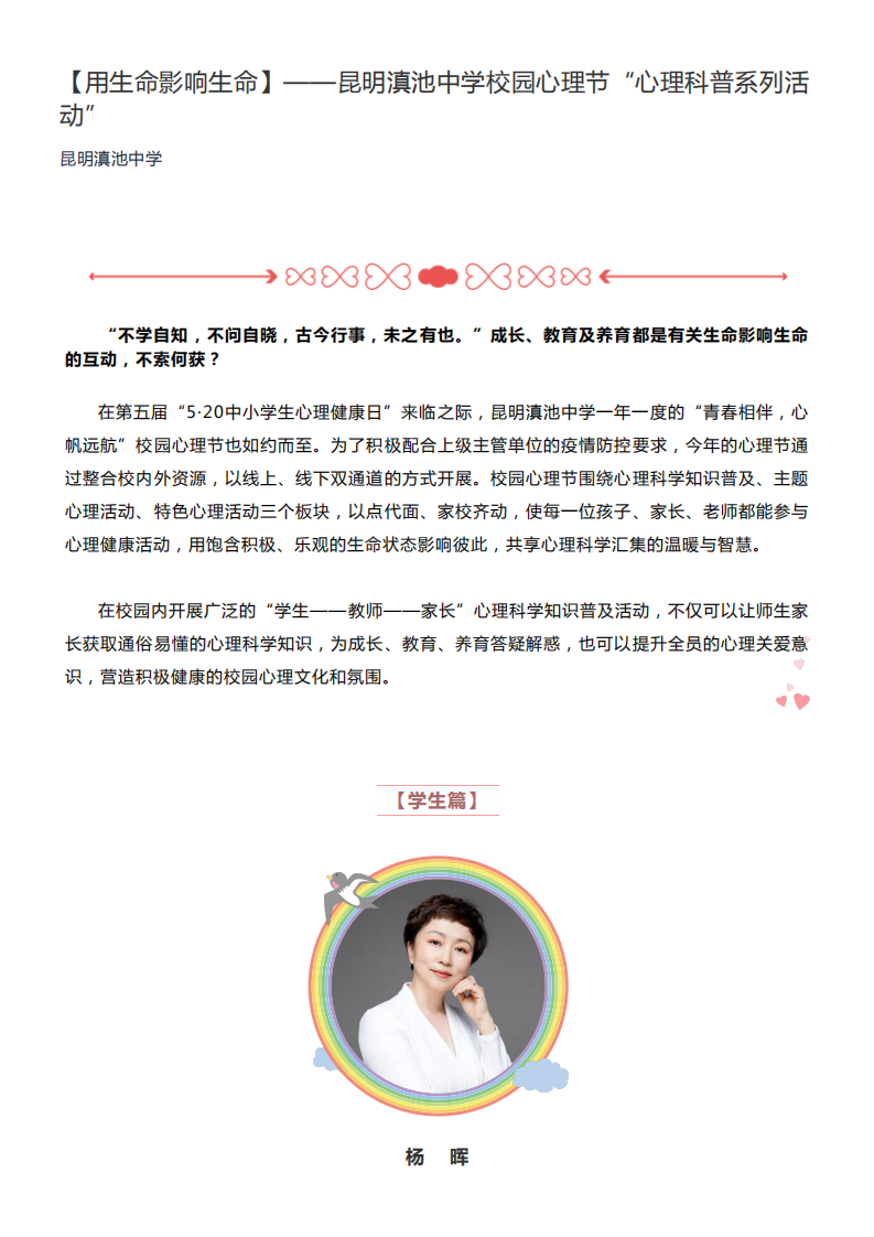 【用生命影响生命】——昆明滇池中学校园心理节“心理科普系列活 动”