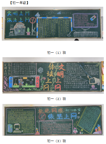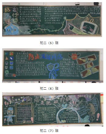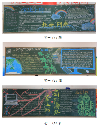 在活动中,各班同学用手中的五彩粉笔制作出一幅幅图文并茂的黑板报,把搜集到的资料在黑板上以自己的风格展现出来,使学生进一步认识到网络上存在的各种安全隐患,学会在虚拟的网络世界中保护自己的利益,理智地对待各种诱惑,不良思想的侵蚀。一张张精美的黑板报表达了学生坚决网络不良信息的决心。让我们一起欣赏各班的精彩作品吧!