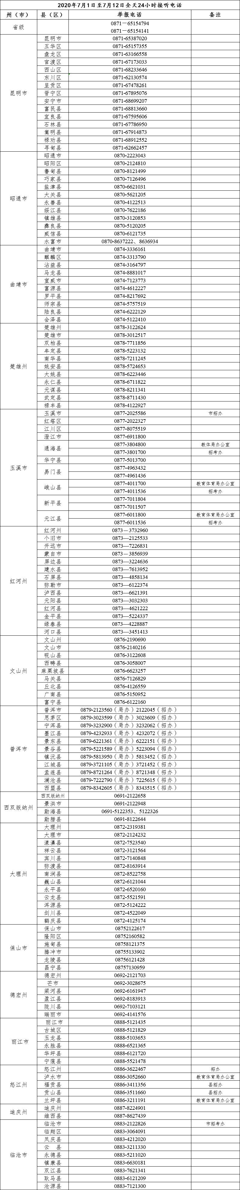云南省2020年普通高考举报电话