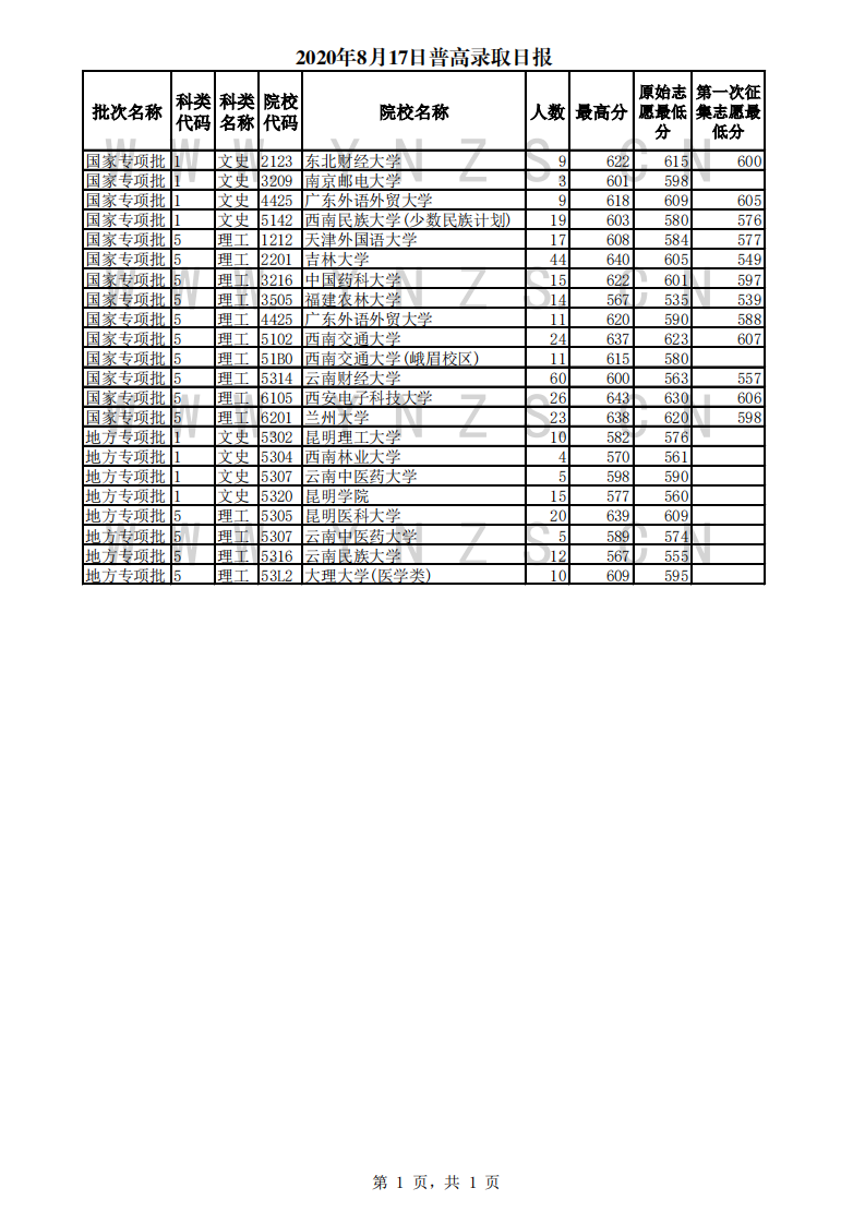 2020年云南省普高录取日报(17日)