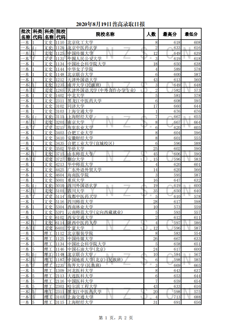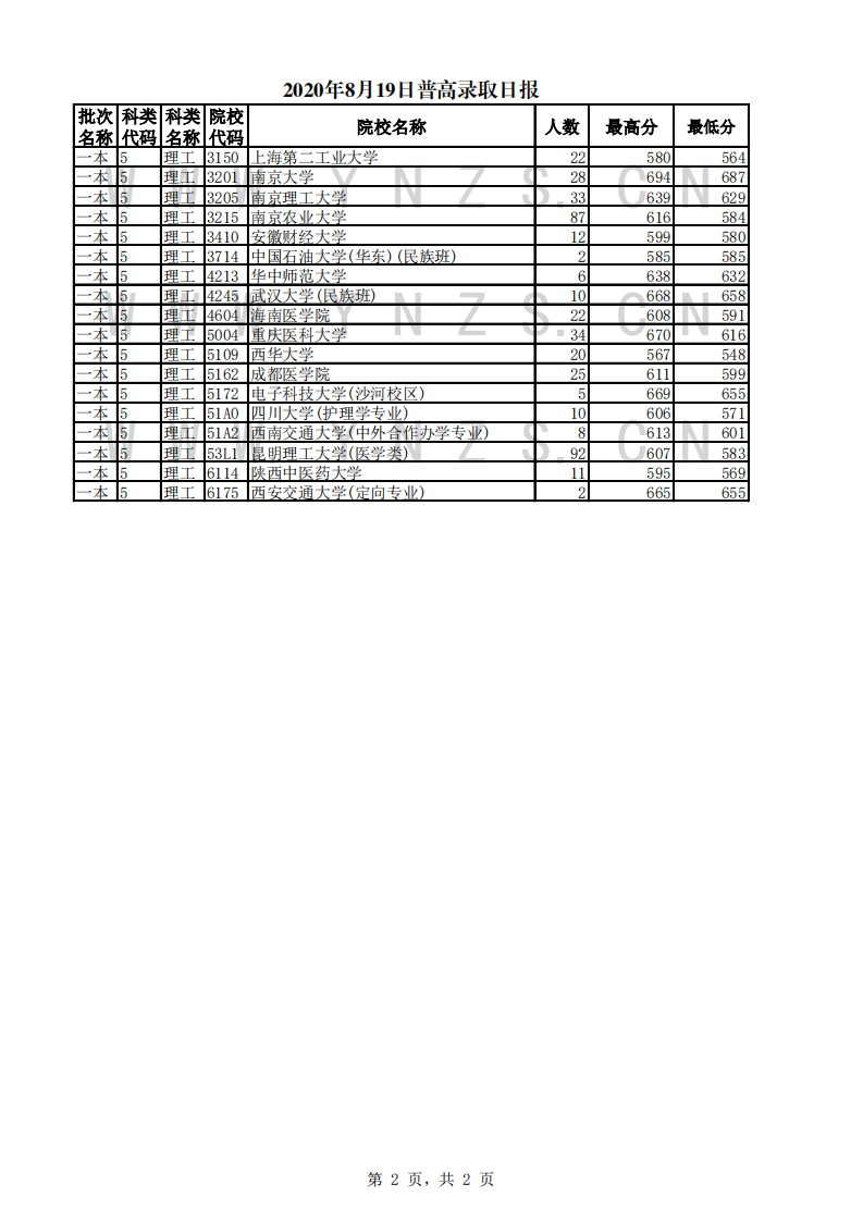 2020年云南省普高录取日报(19日)
