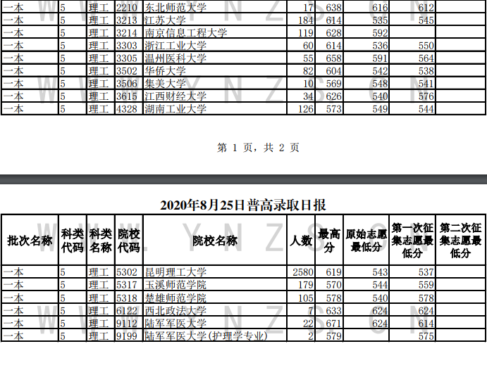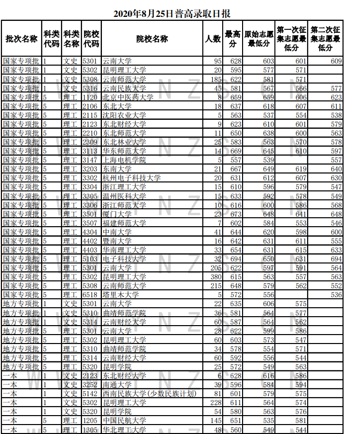 2020年云南省普高录取日报(25日)