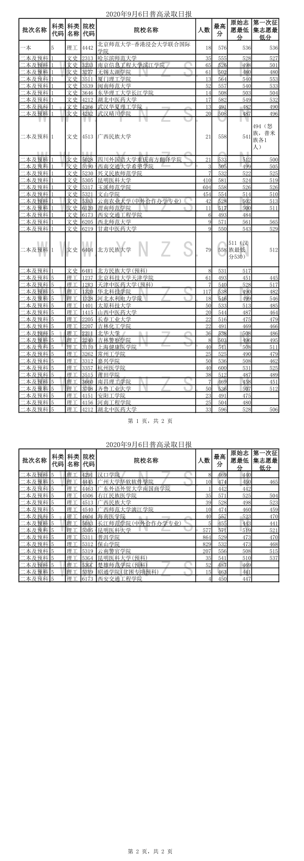 2020年云南省普高录取日报(9月6日)