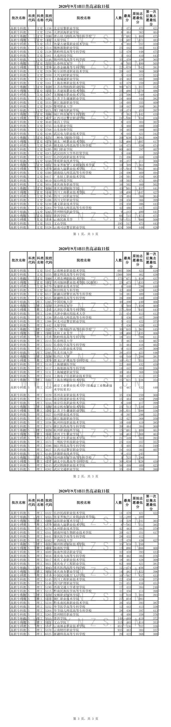2020年云南省普高录取日报(9月18日)