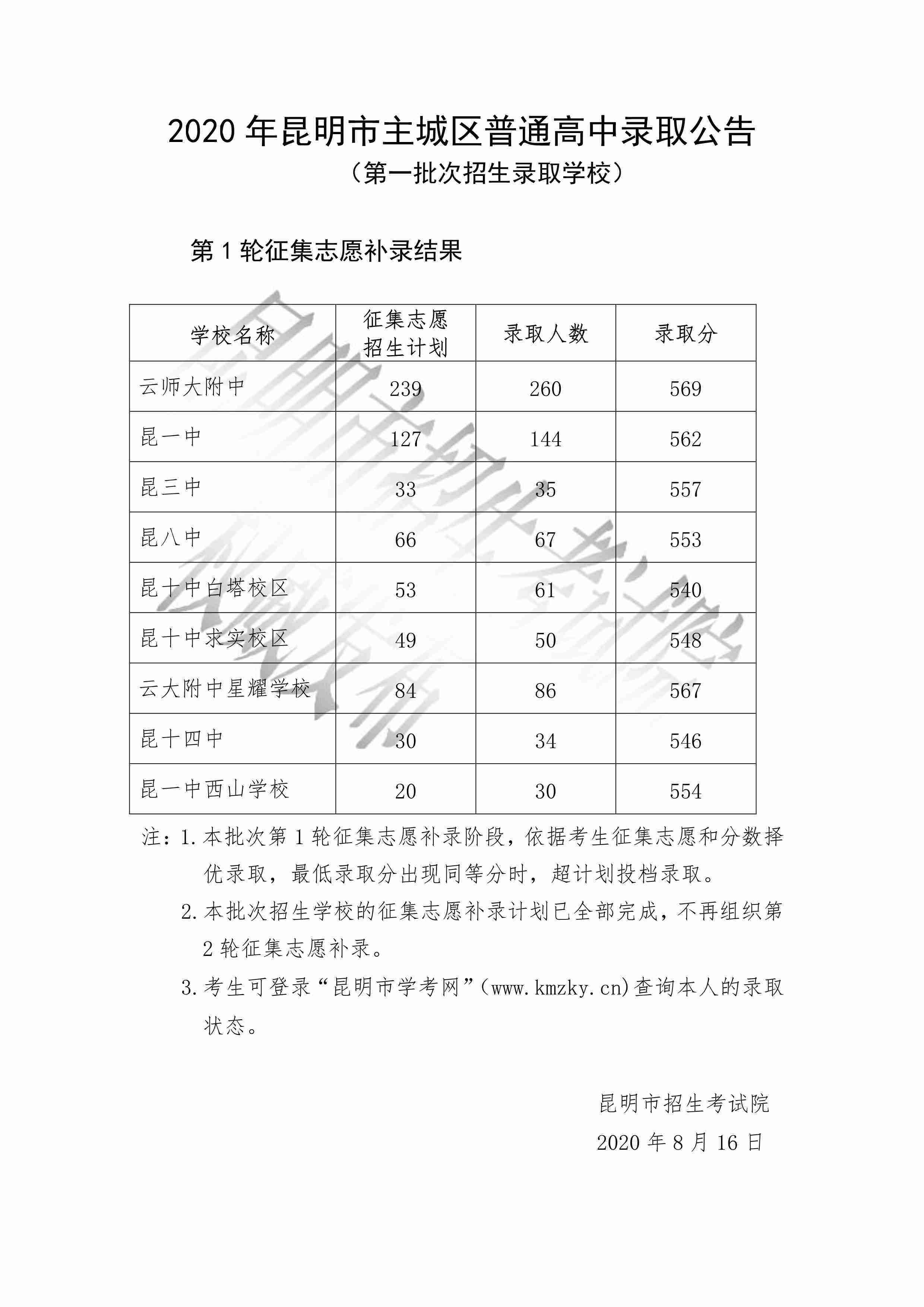 3、2020年昆明市主城区普通高中录取公告(第一批次招生录取学校)第一轮征集志愿补录结果
