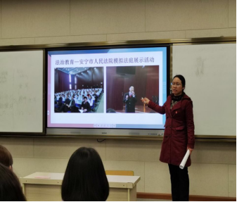 第三,李福莲副校长为实习生展示了安宁市实验学校举办的一系列道德与法治主题教育活动剪影。包括班徽设计比赛、扎染活动、制作绿地图、宪法知识宣传、云南省未成年犯管教所警示教育、云南省未成年犯管教所帮教活动、模拟法庭进校园、情绪脸谱、缅怀革命先烈、参观八街博物馆等活动。