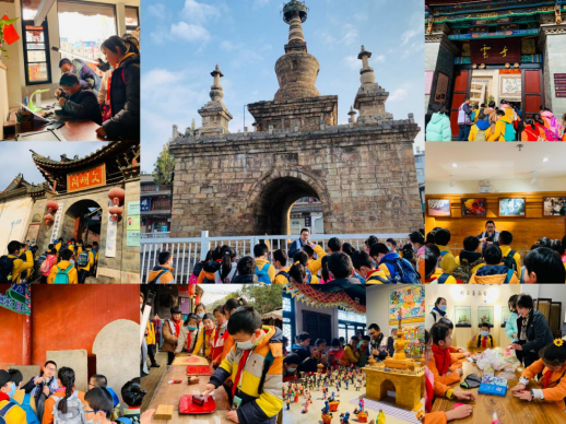 金刚塔、石板路、老戏台、传习馆……古色古香的官渡古镇以它浓郁的历史文化背景和极具特色的人文景观吸引着全国游客。兵分两路的一组同学们跟着官渡古镇管委会、官渡区团区委副书记蔺如景老师游走在古镇标志性建筑金刚塔下,聆听着“官渡”名称的由来——官船停靠的渡口码头;大家入神地看着国家级文物金刚塔,在蔺老师的讲解中再现这座神奇的修砌在螺蛳壳上的砂石塔如何被一点点整体抬升的景象;碑林博物馆内,72方古朴的石碑静静矗立,记载见证着从明代到民国时期,官渡古镇及昆明周边的政治、经济、科技、宗教信仰、教育法律等方面的沧桑变迁;长长的石板路上,滇派民俗馆、云子科普研学基地、乌铜走银传习馆……同学们在赏游途中边听介绍边感受着扑面而来的非遗之美,惊叹于云子围棋白子温润如玉,黑子乌黑碧透晶莹的精湛工艺;乌铜走银传习馆前店后坊,同学们沉浸在敲敲打打、磨制刻画声中,亲历一件件精美绝伦的艺术品在工匠艺人们手中成型;在凡爵艺术馆内,同学们在艺术馆内老师的指导下亲手体验了拓片的过程,如何均匀地滚滚子,如何双手配合刷棕毛刷,如何掌握拓印力度,在老师悉心的指导下,每个同学拓制完成一幅自己心仪之作。在滇派面塑体验馆内,著名的滇派面塑大师刘丽春老师指导同学们尝试着面塑捏制,一朵朵艳丽的花朵,一头头栩栩如生的小牛在同学们手中诞生。