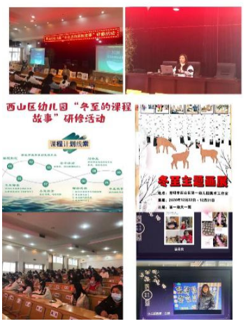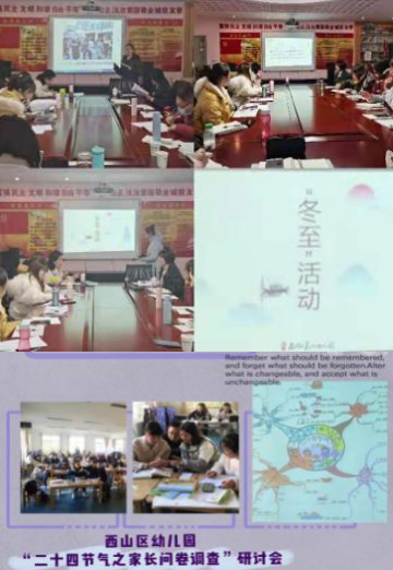 追随教师的专业成长需求,自2020年12月起,西山区教育科研信息培训中心组织各园教师开展“二十节气思维导图制作”“二十四节气课程资源开发”“冬至里的课程故事讲述”等一系列研训活动:云南大学文学院张多教授,带领老师们充分挖掘节气文化中的幼儿教育资源;绘制思维导图的静子老师,引导大家利用思维导图,根据幼儿的实际情况,对节气资源进行筛选和梳理;通过“西山区幼儿园家长关于二十四节气认知的调查问卷”,了解家长对于幼儿园开展节气活动的支持度和关注度,为后续活动的开展提供保障;邀请西山区第一幼儿园代表分享利用节气文化建构“冬至”园本课程的过程,交流困惑和反思,引导教师建立初步的课程意识。针对老师们的困惑,特邀云南省教科院教研员杨凡老师,对老师们进行了专业指导。