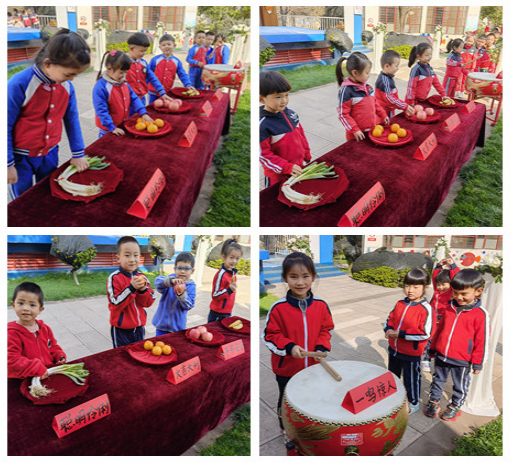 福果送福拉开了主题活动的序幕,小朋友们在老师的带领下,有序地边听老师介绍,边敲一敲鼓(一鸣惊人),边摸一摸苹果(平平安安)、桔子(大吉大利)、香蕉(脚踏实地)和葱(聪明伶俐),走过成长路,感受老师对小朋友们的祝福。