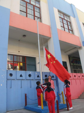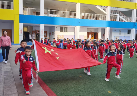 随着进行曲的音乐,混二班4名小升旗手抬着国旗雄赳赳、气昂昂地走来了。升旗仪式开始,小朋友在老师的带领下,注视着鲜艳的五星红旗在庄严的国歌声中冉冉升起。