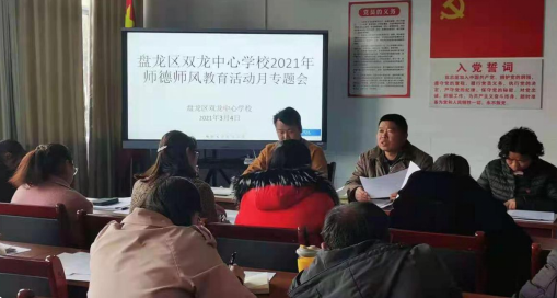 近日,盘龙区双龙中心学校结合实际情况召开师德师风建设会议。旨在进一步规范教师教育教学行为,全面加强德师风建设,引导全体教师做“有理想信念、有道德情操、有扎实学识、有仁爱之心”的“四有”好老师。