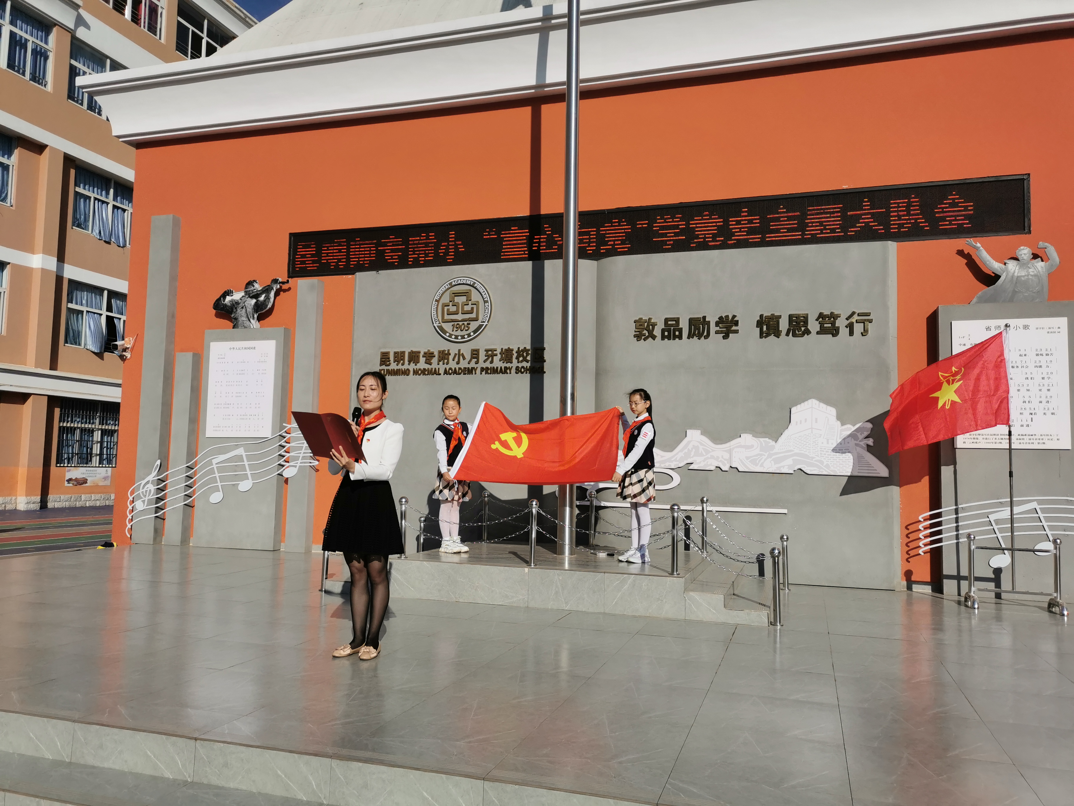 春满芬芳,夏葱茏。为庆祝中国共产党成立100周年,2021年5月10日上午,昆明师专附小月牙塘校区、龙泉路校区全体师生齐聚操场,同时开展“童心向党”学党史主题大队会。本次活动还邀请了到我校跟岗学习的禄劝县九龙中心学校的领导们一同参加。