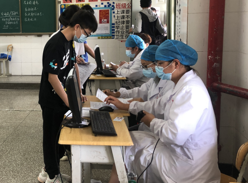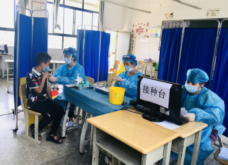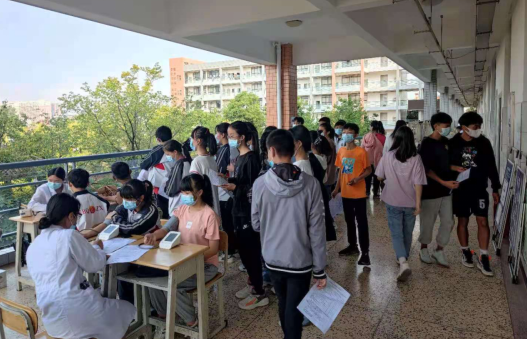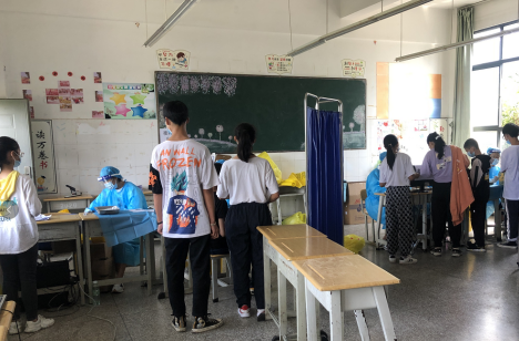 在接种期间,由学校领导牵头,与校内多名教师组成志愿者团队,协助社区医护人员组织学生有序地开展疫苗接种前预约登记、知情同意书填写等工作。尽管前来接种的学生人数众多,但是医护人员们均耐心地为每一位学生进行体温检测、血压测量、健康问询及其疫苗的接种,并逐一告知每位学生接种后的注意事项。他们挥汗如雨,却毅然坚守在岗位;他们不知疲倦,用无声的行动为学生的健康保驾护航。