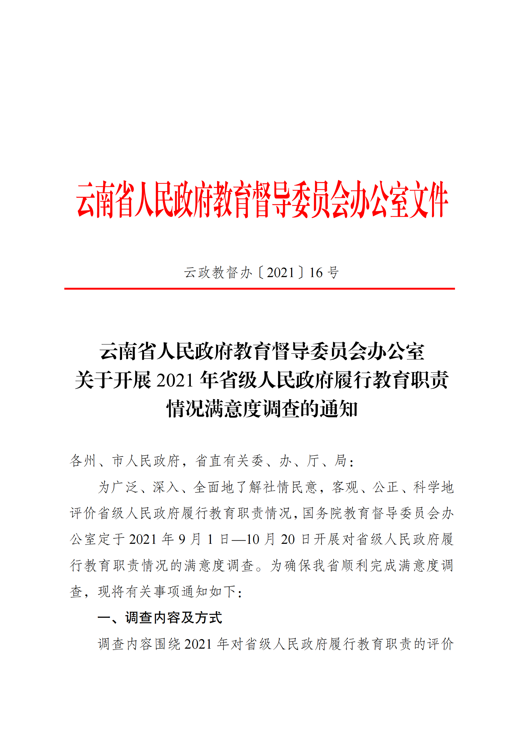 云南省人民政府教育督导委员会办公室关于开展2021年省级人民政府履行教育职责情况满意度调查的通知
