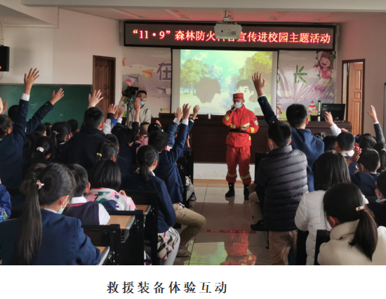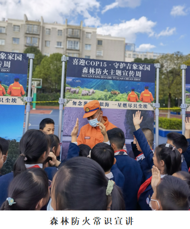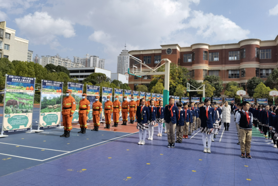 2021年11月9日下午,昆明师专附小月牙塘校区的校园里热闹非凡。来自云南省森林消防总队昆明支队五华中队的消防员叔叔们携带灭火、地震、水域、绳索等救援装备和百幅森林防火宣传展架、主题明信片、野象监测视频图片等宣传资料进入校园,联合昆明师专附小开展11.9森林消防知识进校园主题活动。
