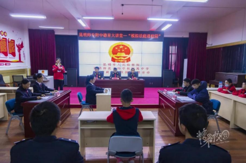 12月9日,伴随着“书记员”一声“全体起立,请审判长、人民陪审员入庭”,一场特殊的“刑事案件审判”在昆明师专附中模拟法庭生动上演,初2024届全体师生正襟危坐,共同聆听“法治”之声。
