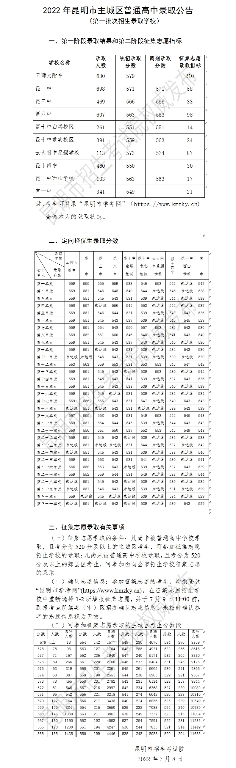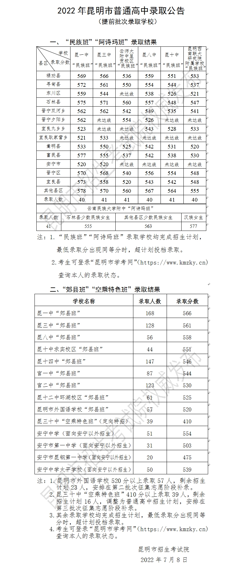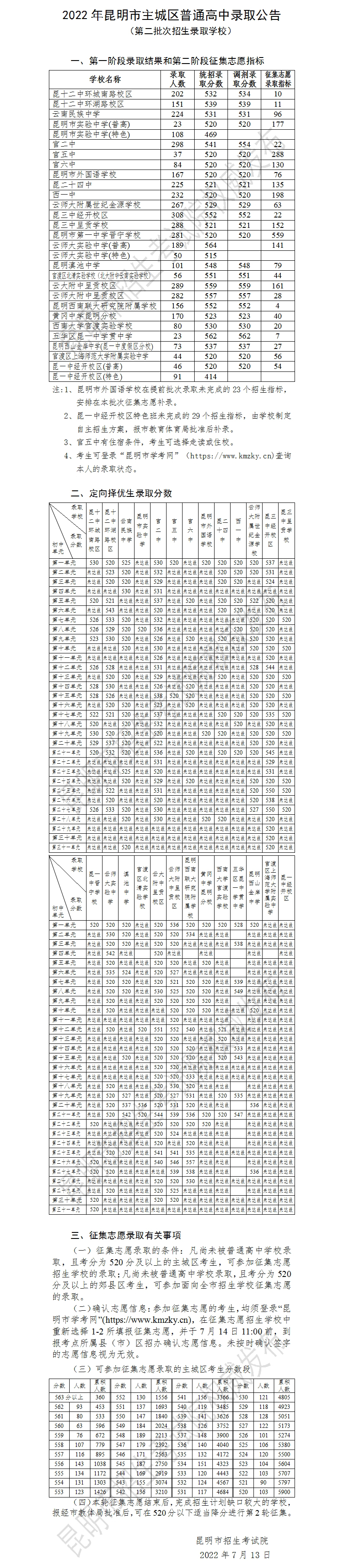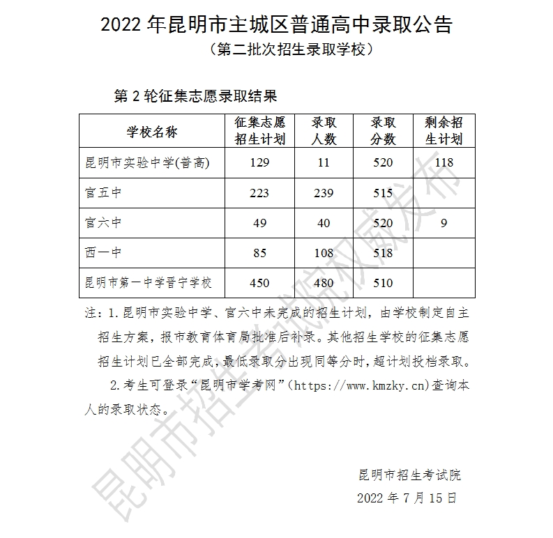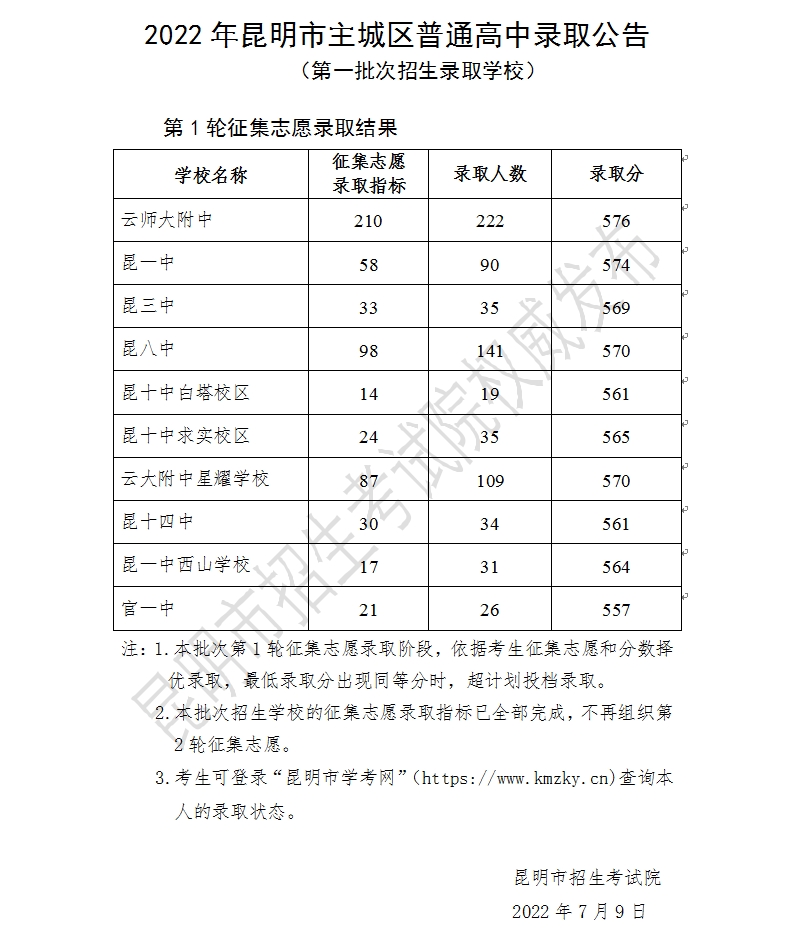 2022年昆明市普通高中录取公告(提前批次、第一批次、第二批次、第三批次)