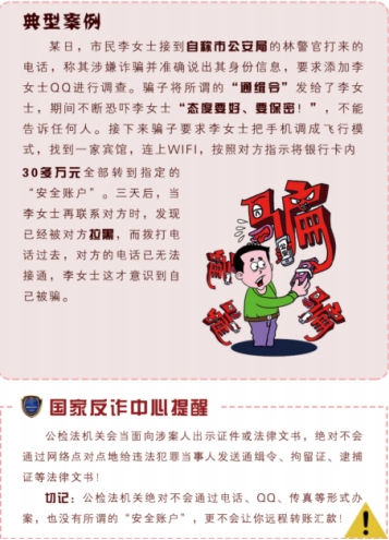 冒充社保、医保中心工作人员,谎称受害人医保、社保出现异常可能被冒用、透支,涉嫌洗钱、制贩毒等犯罪,之后冒充司法机关工作人员调查,便于核查为由,诱骗受害人向所谓的“安全账户”汇款实施诈骗。