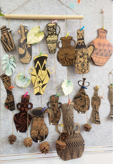 中国彩陶,源远流长,从新石器时期,到今天各式各样的陶瓷艺术,一直生生不息。小小传承人们大胆、合理的创作,运用剪贴的方式让画面的空间感更加强烈。