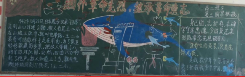 本期的黑板报主题是“缅怀革命先烈、继承革命遗志”。4月4日,团委老师对全校62个班级的黑板报进行检查打分。三个年级主题鲜明,完成情况良好。本期黑板报的目的是提醒全校师生:勿忘历史,以史为鉴,以史立志。
