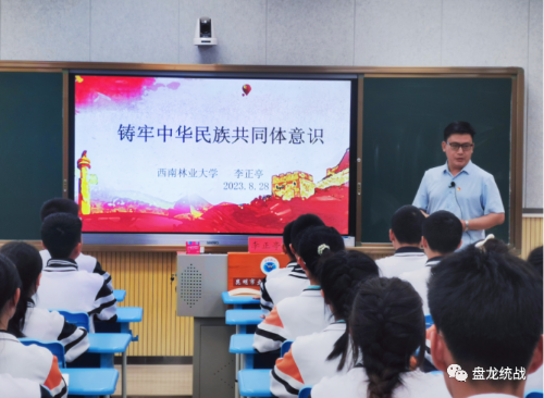 2023年8月28日,盘龙区113所中小学校67400余名学生通过线下集中授课+线上全面授课的方式上好铸牢中华民族共同体意识“开学第一课”,全区中小学广泛开展民族团结进步教育。本次活动由区民族宗教局、区教育体育局共同举办,西南林业大学李正亭教授进行授课,盘龙区财大附中团委书记周潘蕊老师主持活动。