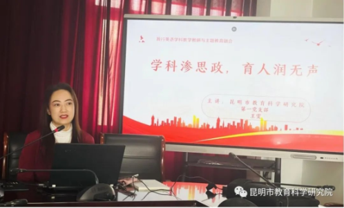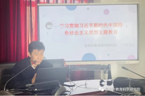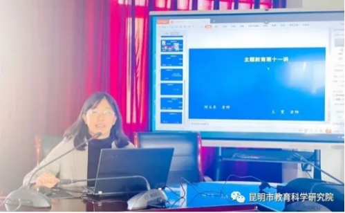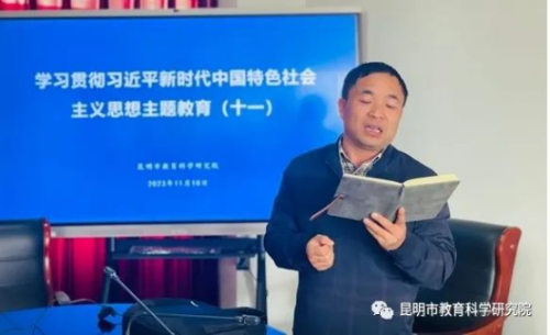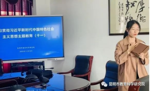 2023年11月10日上午,昆明市教育科学研究院在六楼会议室组织开展了学习贯彻习近平新时代中国特色社会主义思想主题教育第十一期院本培训学习。本次学习由党总支委员、工会主席杨春梅同志主持,高中英语教研员王雯老师、初中物理教研员刘玉东老师主讲,全体教职工全程参加学习。
