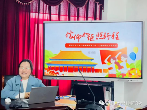 心理健康教育中心教研员杨博雅老师以《信仰如炬照新程——新时代中小学心理健康教育工作 心理教研的文化自助》为题,从课程文化——立足根本深耕课堂,团队文化——合理共进勇于当担,精神文化——提升境界扬帆远航三个方面阐述了心理健康教育的重要性,实施途径与方法。并提出了心理健康教育新方向。杨老师认为,在现代社会,心理健康教育变得越来越重要,因为它对个体、社会和社区都具有深远的影响。心理健康教育有助于预防心理健康问题。通过提供信息和技能,个体可以更好地认识和理解自己的情感和情感需求。心理健康教育可以帮助消除误解,促使社会更加开放和理解,减少对于心理健康问题的社会排斥。心理健康教育有助于提高个体的心理弹性,更好地应对生活中的困难。中小学心理健康教育的实施,要立足根本,深耕课堂,充分利用课堂主阵地,开设心理健康教育课,加强心理健康指导,做到全员育心。要有团队精神,建立合理共进,勇于担当的团队文化,营造人人关注心理健康、人人参与心理健康教育的良好氛围,促进心理健康教育进一步广泛深入的开展。要树立助人自助的理念,相互成就,相互成长。要专业奠基,整合发展,特色突破,用心理健康教育呵护学生健康成长。杨老师认为,心理健康教育新方向在于重视学校心理健康教育,加强心理健康服务,健全社会心理服务体系,拓展个体、群体和社会层面的发展路径等。