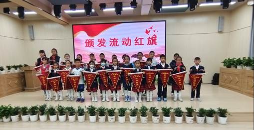 主持人宣读上周文明班级名单,各班代表上台领取流动红旗,希望每个班都争做文明班级,每个学生都争做文明有礼的海源学子。