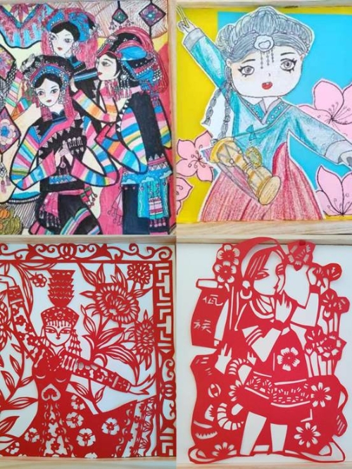 绘民族、筑团结 在了解了一些民族文化之后,孩子们用他们独特的方式描绘他们眼中的民族团结,画出自己所了解的各民族服饰,画出各民族的头饰特色,来增进对民族文化的了解。每一幅作品都是无声的语言,孩子们用稚嫩的双手为“中华民族一家亲”奉上礼物,表达对祖国美好的祝愿,完美诠释了艺术是中华民族文化传承的重要载体。