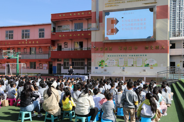 为进一步提高学生安全意识和自我保护能力,筑牢校园安全防线,2024年3月25日,武成小学教育集团联家校区荣幸邀请到云南省五华监狱的领导和警官对全校师生进行主题为“对校园霸凌零容忍”的安全教育活动。