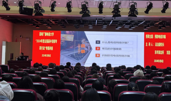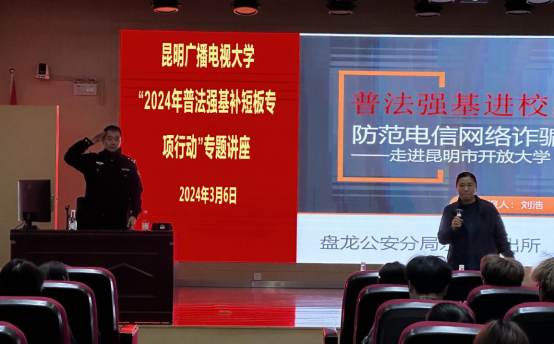 为深入贯彻落实党的二十大精神,全面落实中央关于全面依法治国、推进法治中国建设的决策部署,贯彻省市2024年普法强基补短板专项行动工作要求,提升学校师生的法治素养,提高普法针对性和实效性,2024年3月6日,学校特法治副校长—东华派出所刘浩警官到校为全体师生作《预防电信诈骗》知识讲座。