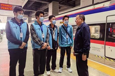 在昆明南站,穆仁早与学生代表交谈,了解当日客流情况,仔细询问同学们实践岗位、学习收获与体会,对同学们的表现和精神状态充分肯定,要求同学们善于向师傅学习,善于在实践中感悟,提高能力和本领。