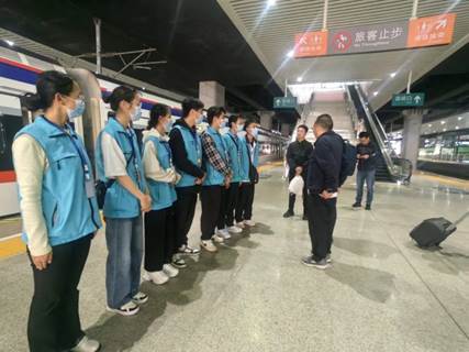 为了解昆明铁道职业技术学院实践育人情况,2024年4月13日,昆明市教育体育局党组书记、局长穆仁早和党组成员、副局长杨文佳,在昆明南站、西双版纳站、磨憨站,走访看望在工作岗位上的学院参加岗位实习的学生代表。