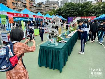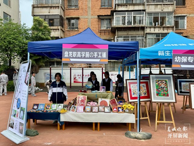 操场的另一旁,盘龙职高贸易节也同时开启。雕刻拼盘、美术作品展示、汽修文创……各专业同学展示专业技能、展现自我风采,现场热闹极了。