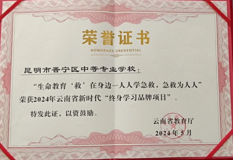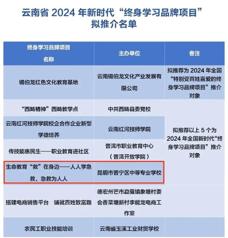 日前,由教育部、中央宣传部等五部委主办的2024年全民终身学习活动周全国总开幕式上公布了194个全国新时代“百姓学习之星”和191个全国新时代终身学习品牌项目”宣传推介名单。云南省共有5个项目入选全国新时代终身学习品牌项目,昆明市晋宁区中等专业学校《生命教育“救”在身边,急救为人人》榜上有名!