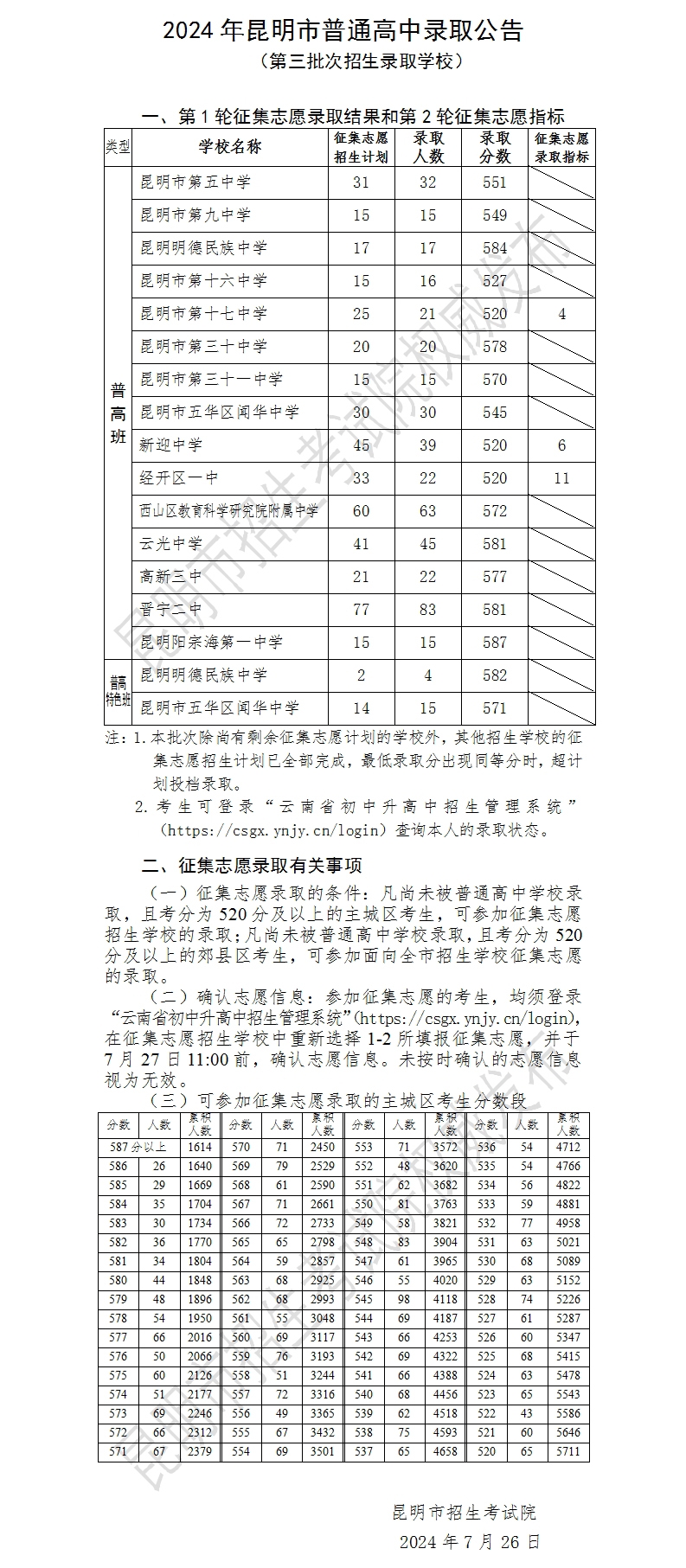 2024年昆明市普通高中录取公告 (第三批次招生录取学校)