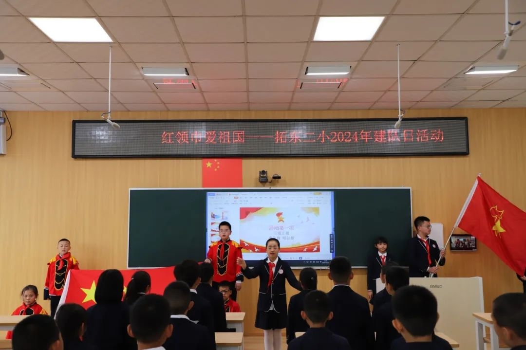 联盟小学举办“红领巾爱祖国”建队日活动,优秀少先队员为二年级新队员佩戴红领巾,全体队员在队旗下庄严宣誓,用歌声表达热爱党、祖国、人民的情感,坚定听党话、跟党走的信念。