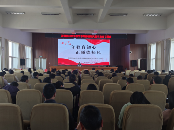 为进一步加强教师队伍师德师风建设,提升教师职业道德素养和规范职业行为,嵩明县教育体育局于2025年2月20日召开了2025年春季学期师德师风警示教育专题会议,全县中小学校长、书记、幼儿园园长180余人参会。