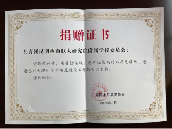 校团委、少先队组织同学们大理白族自治州永平县的山野书屋捐赠了书籍。一本本书籍,为山区孩子送去知识与希望。虽相隔山川,却传递着无尽希望,让雷锋精神在爱与奉献中得以延续。